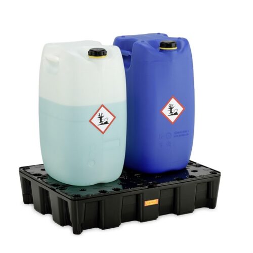 Wanna wychwytowa na 2 IBC została wykonana z mocnego, odpornego na chemikalia polietylenu. Wanna z rusztem metalowym i dodatkowo na specjalnych wzmocnieniach – stopach do utrzymania palety lub pojemnika. Wysoka jakość i wytrzymałość wanny daje gwarancję długiej żywotności w warunkach przemysłowych. Przeznaczona do składowania olejów, chemikaliów (również tych agresywnych). Paleta spełnia wymagania dyrektyw europejskich i zaostrzonych przepisów dotyczących magazynowania substancji na wannach wychwytowych. Specjalne żłobienia umożliwiają przewożenie wózkiem widłowym. Wanna z nasadką do napełniania.